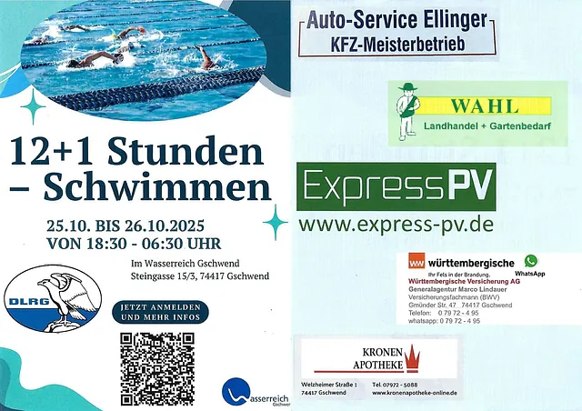 Dazu gehört auch das DLRG Gschwend und das Hallenbad Wasserreich Gschwend, die wir beim 12–1-Stunden-Schwimmen am 25.–26.10.2026 als Sponsor begleiten.