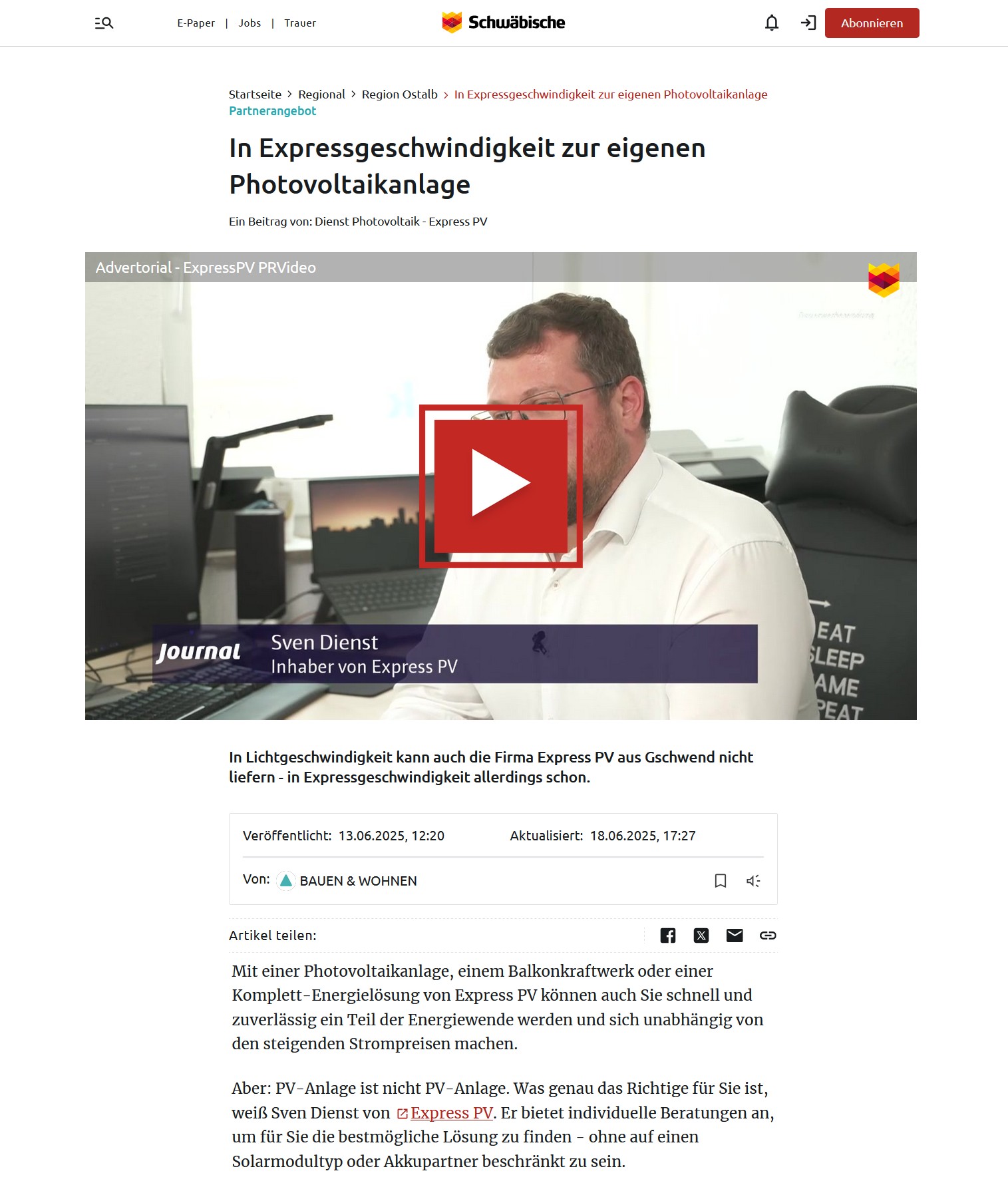 Express PV durfte mit einem Ihrer Kunden als Fachstimme (Branchenexperte) in der Sendung BAUEN & WOHNEN auf wichtige Fragen Rede und Antwort stehen.
